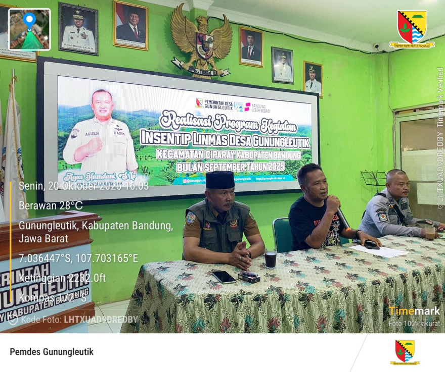 Senin, 20 Oktober 2025 Pemerintah Desa Gunungleutik Melaksanakan penyaluran Insentip bagi Linmas Gunungleutik dilaksanakan di Aula Desa Gunungleutik Kecamatan Ciparay Kabupaten Bandung.