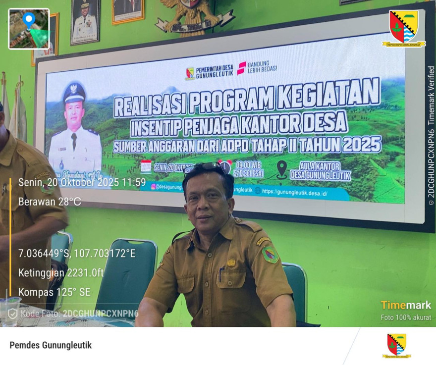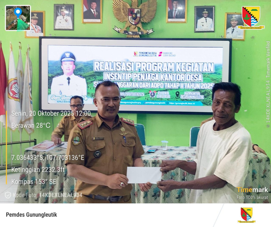 Senin, 20 Oktober 2025 Pemerintah Desa Gunungleutik Melaksanakan penyaluran Insentip bagi Penjaga Kantor Desa Gunungleutik dilaksanakan di Aula Desa Gunungleutik Kecamatan Ciparay Kabupaten Bandung.