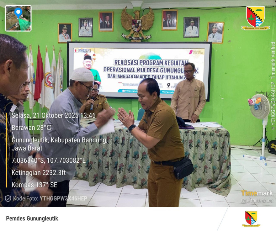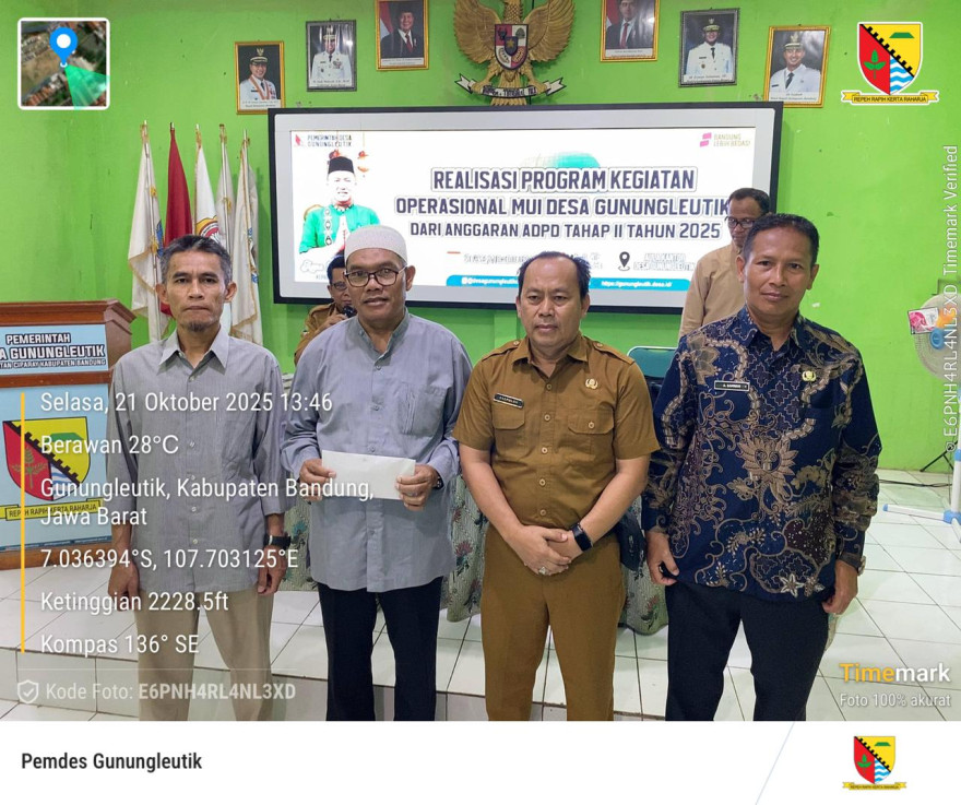 Selasa, 21 Oktober 2025 Pemerintah Desa Gunungleutik Melaksanakan penyaluran Operasional Bagi Lembaga Desa Gunungleutik Yakni MUI Desa dilaksanakan di Aula Desa Gunungleutik Kecamatan Ciparay Kabupaten Bandung.