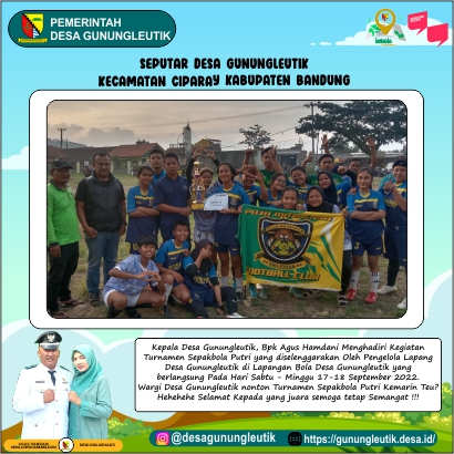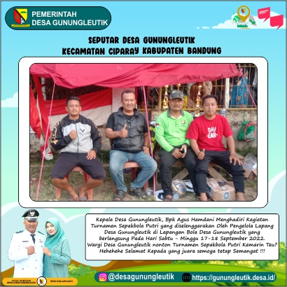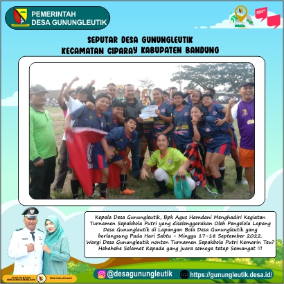 Kepala Desa Gunungleutik Bapak Agus Hamdani Menghadiri Kegiata Turnamen Sepakbola Putri yang diselenggarakan oleh Pengelola Lapang Desa Gunungleutik, Semoga Dengan adanya kegiatan turnamen Sepakbola Putri ini bisa menambah relasi dan silaturahmi antar Tim Sepakbola....